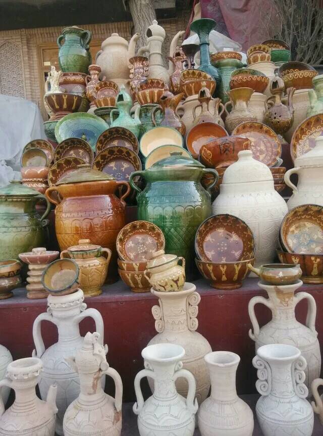 在古城的旁边是有名的花盆巴扎,出售的都是维吾尔族传统手工制作的土陶制品,被称为“泥巴艺术”。据考古发现土陶制品在新时器时代就已出现,至今仍沿袭古老原始的制作方式。制作土陶选用的是当地的河泥做原料,先将胶泥浆泡,经踩、揉、和等工序后,使胶泥有黏性和强度,再上辘轳转坯成型,经削、刮、刻然后晾干,彩绘上釉,装窑火烧多半天,散热后出窑。制作土陶的过程是在没有任何图纸和任何模板的情况下进行的,完全靠手感和经验制作。土陶有专用于生活的物品,也有做装饰的精美工艺品,颜色和图案多以维吾尔族人们喜欢的伊斯兰风格的颜色和图案构成。行走在精美的土陶世界里,会深深的陶醉其中,因为每一件土陶制品都是独一无二的,都会让你爱不释手,忍不住要买上1-2件带回家。