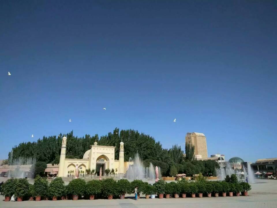 再往前走就来到了著名的艾提尕尔清真寺。这座有着几百年历史的清真寺在春日里格外的静谧,偌大的广场上除了虔诚的信徒,还有三三两两来自各地的游人。一个暖心地画面突然映入眼帘,墙角一个红衣少女背靠在寺院外的墙壁上,尽情地享受着春日暖阳,悠闲的看着手机。一群白鸽在广场上欢快的上下翻飞,一个小规模的花市吸引着人们驻足观看选购,清真寺周围是各类商铺,从黄金、珠宝、玉器到吃穿、日用品、土特产,从国内商品到国外商品一应俱全,到这里来购物的人络绎不绝,所以这里也成为喀什商业中心之一。每到重要的节日,艾提尕尔广场成为欢乐的海洋,几万人在广场共同起舞,场面十分壮观,自然也成为摄影爱好者的天堂,看着每一个高楼顶上架满的摄影设备便知。