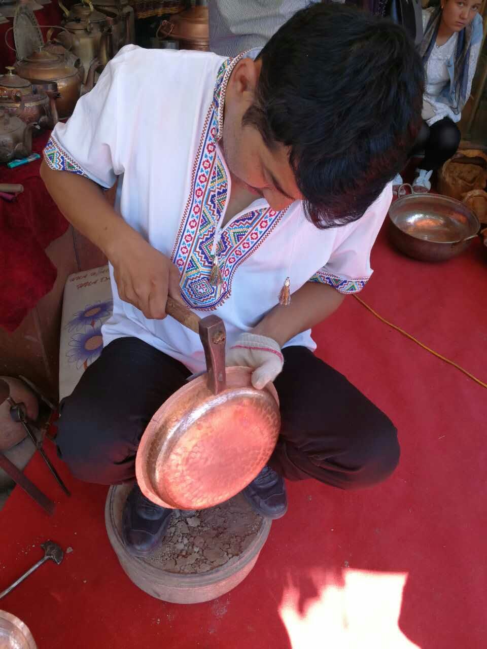 穿过两个巴扎,就来到著名的吾斯塘博依手工品一条街,远远的便听到叮叮当当的敲击声,那是铁器相互碰撞发出的清脆声音。这条街上的大多数店铺都是纯手工制作各类铜器、铁器,一只炉身通红的铁炉、一把锤子、一堆雕刻工具就是这些手艺人的家伙什,不起眼的铁块经过手艺人的一番加工,就变成各种生活用品。这里最值得一提的是铜壶,这是维吾尔族生活必备品,因铜有祛湿的作用且耐用,备受维吾尔族人的喜爱,家家户户都有铜壶、铜碗、铜盘等。虽然在现代工艺的冲击下,手工打制的铜制品远不如机器生产出来的精美、漂亮,但维吾尔人始终不变的喜爱手工打制的各类铜器。每一个铜器从原料到成品要经过几十道工序,制作一把铜壶往往需要3-5天的时间才能完成,手工艺人们把自己对原料的把握和理解都融入到每一次敲打、每一刀雕刻之中,实现人与器的完美结合。当拿到一把做工精美的铜壶时,我们只看到了它的外表,却很难理解手工艺人日复一日、年复一年的坚守与执着。手工艺品制作都是家族式的传承,子承父业,口口相传,手把手传授,经过3-5年的学习才能出师。看到白发苍苍老师身旁那个静静蹲着、瞪大眼睛的巴郎,就知道了手工艺制作的技艺将在下一代得到传承。