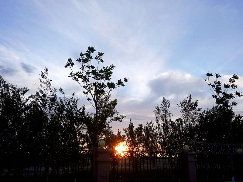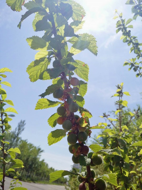进了大门的主干道两边,栽种的有桃树。福海的春天来的实在是晚,五月份的时候才将将看到桃花盛开。现在再去,碧绿的桃叶下藏着一个又一个青涩的小毛桃,最大的可能也就比拇指大不了多少。你一定知道它是不能吃的,但是却绝不妨碍你,看到它就觉得满心欢喜。