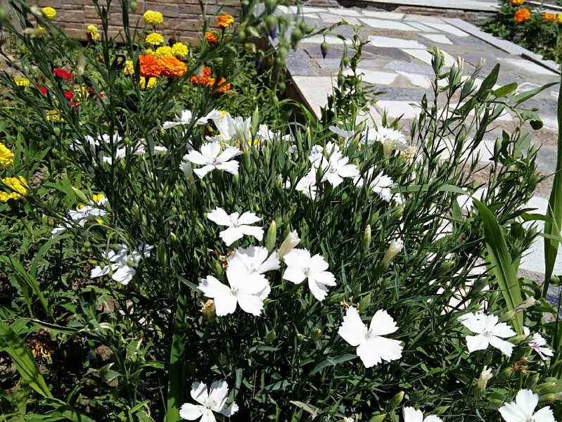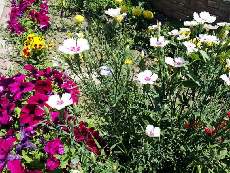 在这片花海之前,我最喜欢的地方是单位备勤楼前的木质长廊。最早的时候还搭架子种了葡萄,结出的果子也就小拇指这么大,偏酸。但是每次路过我都要摘几颗吃,哪怕是酸的呲牙咧嘴的。可能是我的目光太炙热,葡萄它总也不好好长,后来领导就把它们移到别处去种了,省得我这种吃货天天祸害它。现在,长廊下面也种满了各色草花。石竹、三色堇、矮牵牛、万寿菊……傍晚的时候在长廊下小沁,别是一番惬意挂心头。