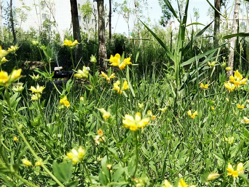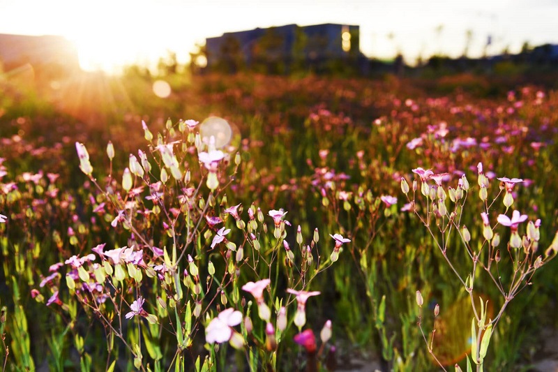 越过水管再往前走,路口左转过去,是长长地一条路。以往路两边都是草木未经修剪、肆意生长,走凌乱美路线。土地平整之后,路的右侧专门留出了一块空地,种上了草花。还记得四月下旬大家扛着铁锹扫把去平地,当时知道这里要种花以后,我还开玩笑说要带上小铲子偷偷地挖几颗回去种在办公室。可惜自那以后渐渐就忙起来了,不是加班就是值班,我竟没有再去那条路上走一走看一看。然而草花们还是不紧不慢按部就班地生长着,在我不知道地时候汇聚成了一片海洋。