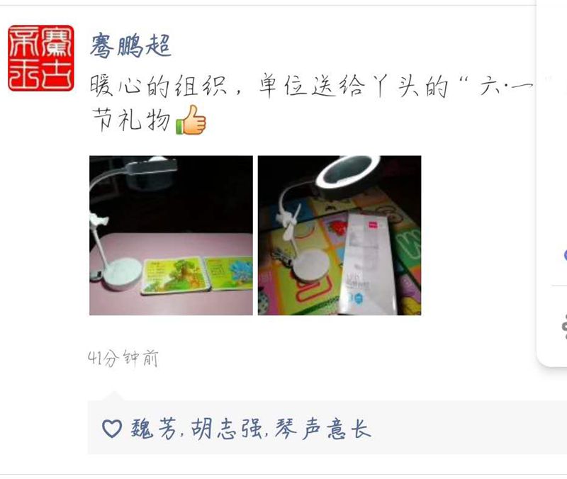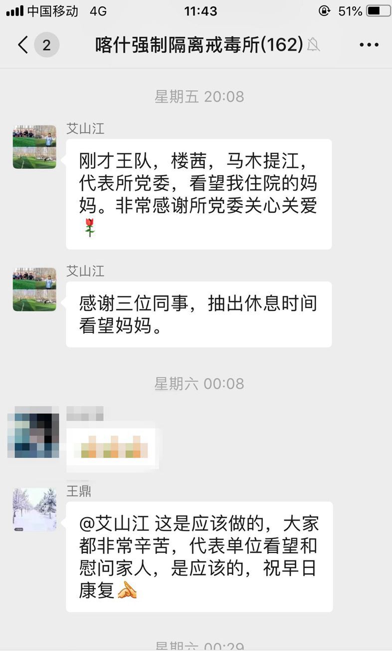“刚才王队、楼茜、马木提江代表所党委看望住院的妈妈。非常感谢所党委的关心关爱”