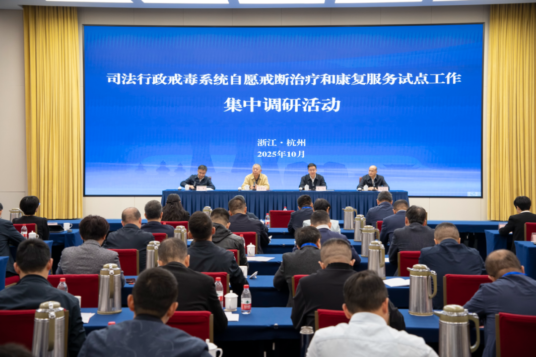 10月22日,全国司法行政戒毒系统自愿戒断治疗和康复服务试点工作集中调研座谈会在杭州召开。司法部戒毒管理局局长章常宁出席会议并讲话。浙江省司法厅党委书记、厅长戴纪致辞,对全国试点省份同行同志莅临杭州调研交流表示诚挚慰问和衷心感谢。会议分析戒治康复试点工作情况,交流工作经验,深入部署开展自愿戒断治疗和康复服务工作。