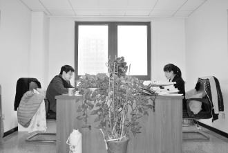 上午9时,法律援助工作司指导处副处长丁天球和工作人员丛卉正在埋头工作。