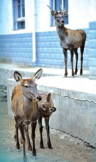 昨日下午,市动物园园长雷青海率饲养、护理等职能工作组到达甘肃省第二劳教(强戒)所。最小的马鹿仅高五、六十厘米,看到有人拿着草接近,天生不怕人的母鹿带着小鹿就凑过来吃草。而健壮的雄鹿看到大批人员的到来,则显得焦躁不安,不时向栏杆外的人作出冲顶状。动物园工作组决定按计划实施吹管麻醉。