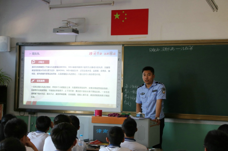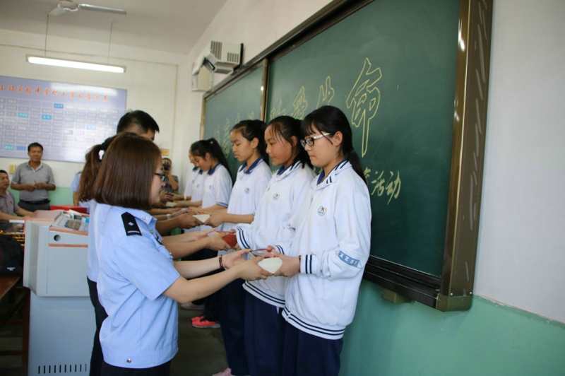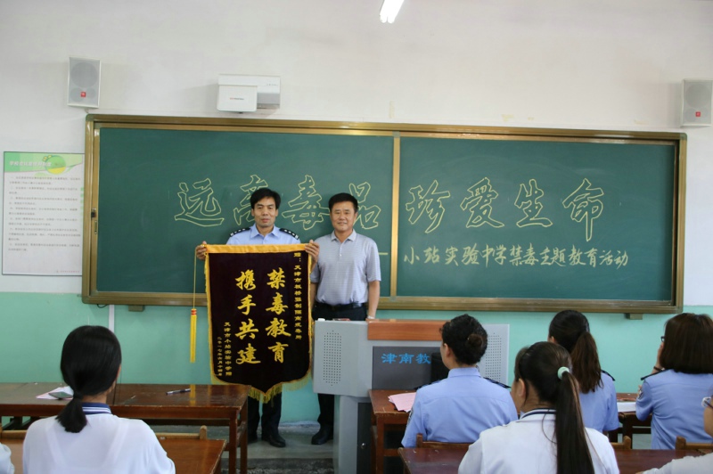 6月14日,骄阳似火,青年志愿者们的情绪高涨,肩负着神圣的职责怀着激动的心情走进校园宣传禁毒知识,本次活动由政治处主任带队,所团委挑选了7名有丰富工作经验的精兵强将作为青年志愿者代表。小站实验中学校长邵长春、副校长张洪武亲自组织,安排初中二年级六个班级将素拓课作为此次禁毒教育课,统一时间,同时授课。活动中,青年志愿者向学校赠送了禁毒知识手册和宣传材料,号召全体学生们要认真学习毒品知识,提高防毒拒毒自我保护意识,增强明辨是非、抵制诱惑的能力,筑牢思想防线,全体师生和志愿者在印有“珍爱生命 远离毒品”的宣传布标上签名,倡议学生们做“珍爱生命 远离毒品”的好少年。