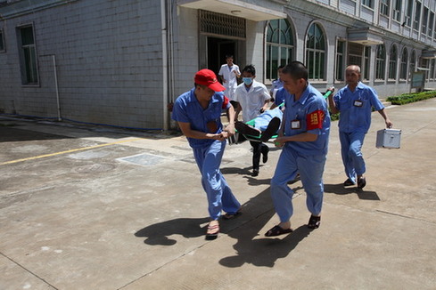 演练按预定方案进行,上午11时16分,该所习艺楼二楼五大队习艺车间因操作不当发生火情,警报拉响,演练总指挥吴忠副所长随即下达启动应急处置命令,立即组织民警和学员安全员赶赴现场救火,同时组织一、五、六大队的学员紧急疏散,各队民警迅速按照指令组织本队学员按班组距离门口远近顺序撤离习艺现场,5分钟后,所有学员安全撤离到指定地点。医疗救护组民警对救火中“受伤”的学员及时进行救护,并用担架将“伤员”迅速抬到指定地点,火势在3分钟后被扑灭。