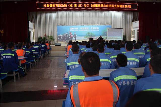 4月11日上午,吐鲁番教育矫治局(戒毒所)党委委员、副局长艾克拜尔·奴尔组织基层大队维族民警及全体戒毒人员集中学习《新疆维吾尔自治区去极端化条例》。