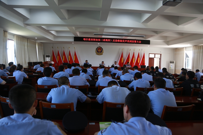 2017年5月19日下午15:00,喀什教育矫治局(戒毒所)会议室里,民警职工着装整齐威武,饱含庄严之情,为响应向自治区优秀共产党员、民族团结进步模范吾布力喀斯木•买吐送同志发表的《致维吾尔同胞觉醒书》学习进而发生表态的号召,一场会标为“喀什教育矫治局(戒毒所)反恐维稳发声亮剑大会”的隆重仪式正在进行。