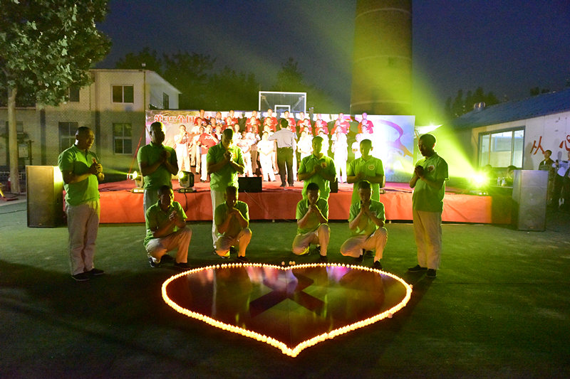 夜色降临,在主持人的引导下,戒毒人员用蜡烛摆出心的形状,手捧烛光,表达对生命的敬畏以及对未来美好生活的祈愿。