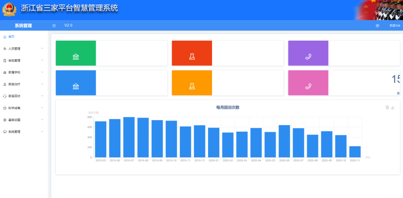2019年度省局科学戒毒优秀创新项目 项目介绍:“三家平台”智慧管理系统立足于构建以家庭修复、重建、跟踪为主线的“衔接帮扶”网络,建立以“三家平台”为主要内容,集数据采集、智能分析、实践指导等功能为一体的大数据分析平台,实现家属学校、家庭治疗、家庭回访的数据整合。 版权专利情况:2019年11月4日,“三家平台”智慧管理系统获得国家版权局计算机软件著作权登记证书。