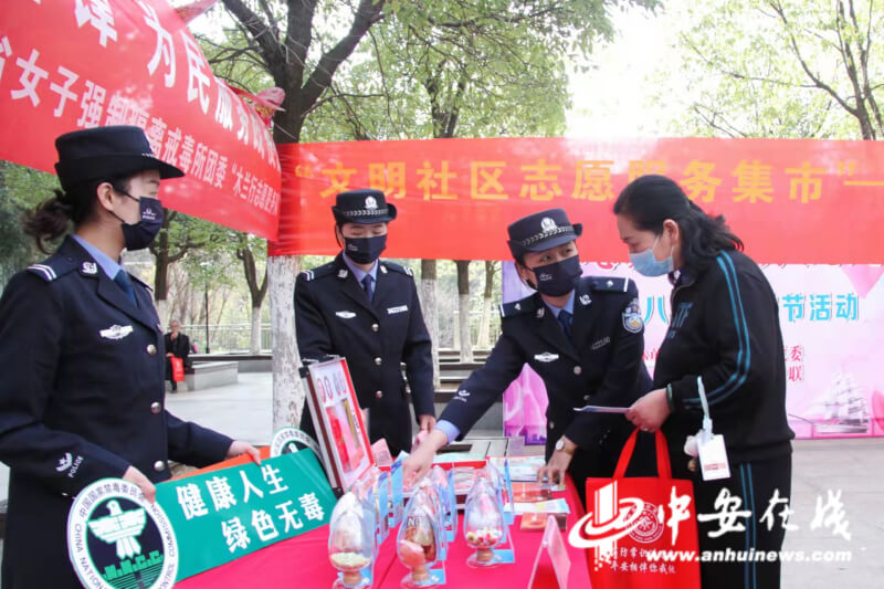 3月4日下午,安徽省女子戒毒所“木兰行”志愿服务队队员在蜀山区五里墩街道团安村社区文明社区青年志愿者服务大集上“摆摊设点”,发挥自身专长,热情为居民们开展禁毒戒毒宣传教育,提供法律咨询便民服务。