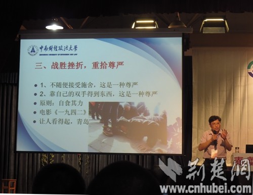 当天的讲座从美国已普遍开展、成熟的“死亡教育”开始,通过直面死亡,教导戒毒人员一方面要减少对死亡的恐惧,另一方面要体悟生命的脆弱,从而尊重生命;接下来,刘教授从人类生存的社会学上意义上,讲述人类活着的意义;经过以上的两个迂回,最后刘教授讲述了本次讲座的重点:战胜挫折,重拾尊严。他首先分析了产生吸毒的各种可能原因,结果是殊途同归,都想用一时的快感逃避挫折,到头来尽失尊严;在结束讲座前,刘教授向戒毒学员介绍了四个方法戒断毒品,挽回自己的尊严。