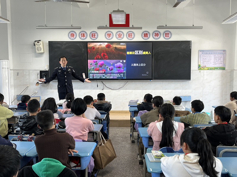 在学校,宣讲民警围绕罂粟的生长周期、生长特征及危害三个方面为同学们上了一堂罂粟科普课,号召同学们争做禁毒小卫士,向家长宣传“禁种铲毒”知识。
