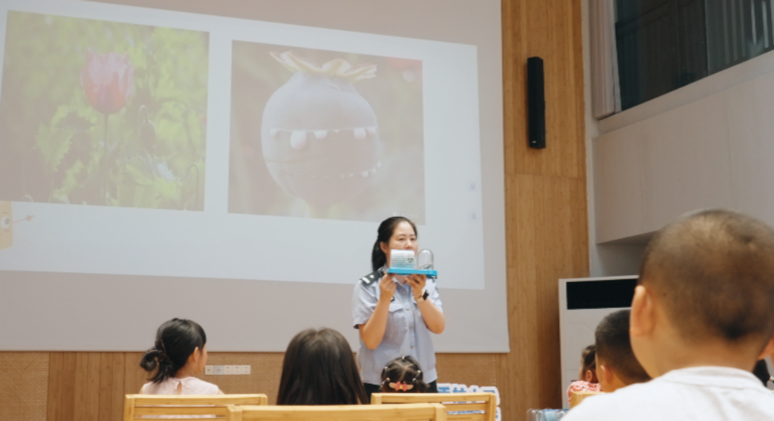 我所“蒲公英”禁毒法治宣讲团民警组织了一场“仿真毒品模型展”,以生动有趣的互动问答形式,向孩子们普及毒品种类与危害,孩子们聚精会神地听着,不时提出问题,现场气氛热烈。