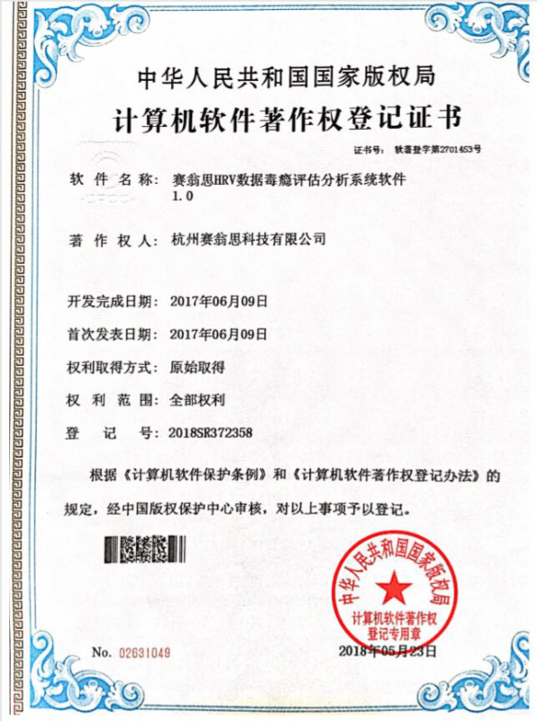2018年5月23日,赛翁思HRV数据毒瘾评估分析系统软件1.0获得国家版权局计算机软件著作权登记证书。