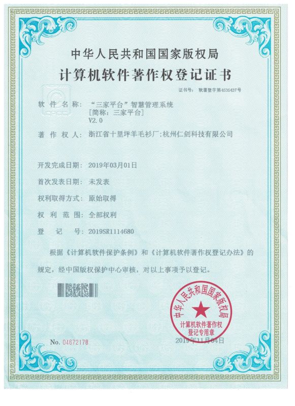 2019年11月4日,“三家平台”智慧管理系统获得国家版权局计算机软件著作权登记证书。
