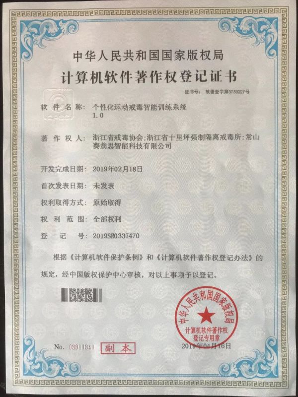 2019年4月16日,个性化运动戒毒智能训练系统1.0获得国家版权局计算机软件著作权登记证书。
