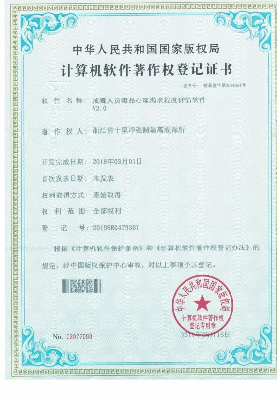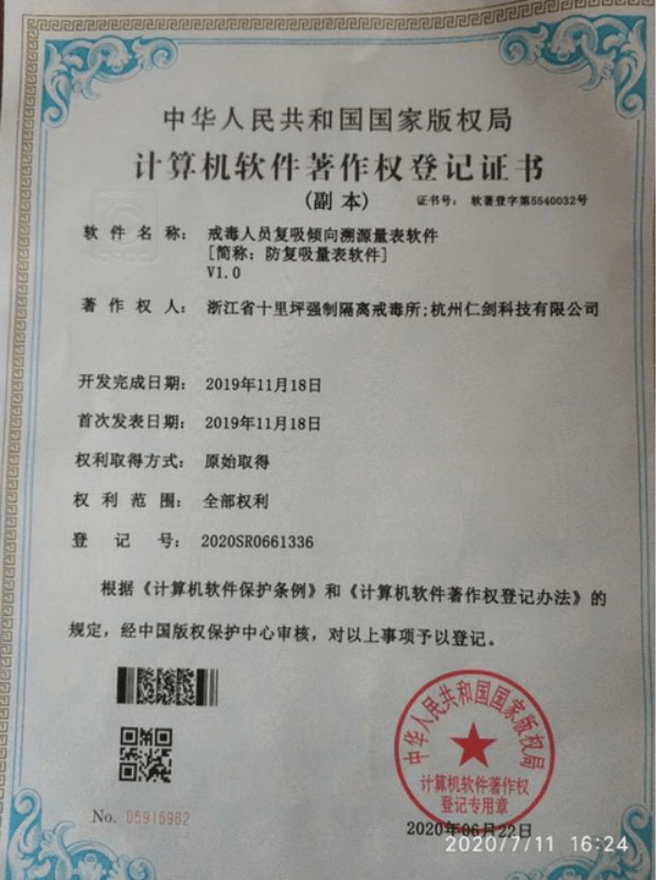 2020年6月22日,戒毒人员复吸倾向溯源量表软件V1.0获得国家版权局计算机软件著作权登记证书。