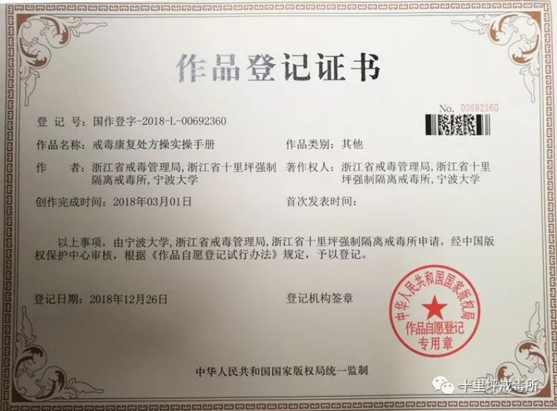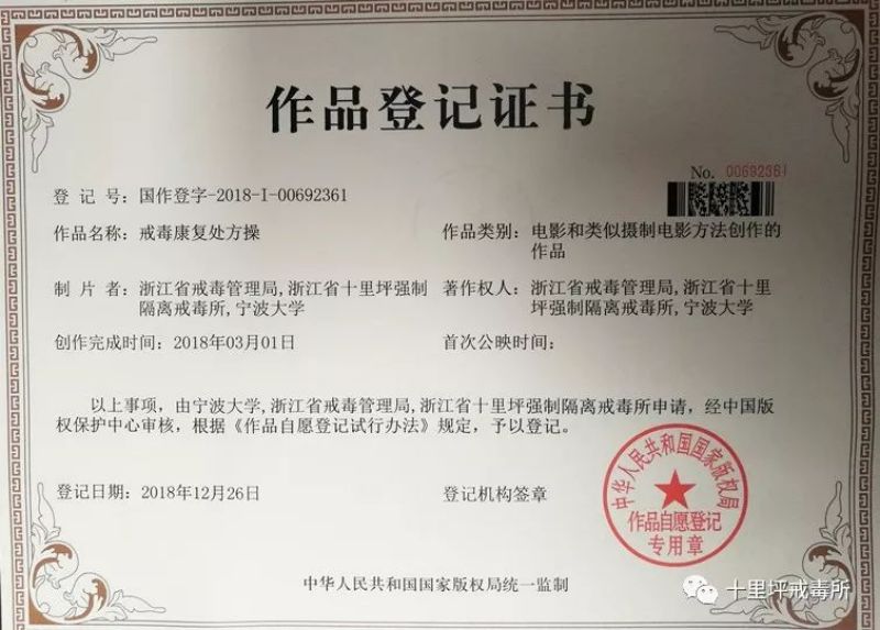 2018年12月26日,戒毒康复处方操获得国家版权局作品登记证书。