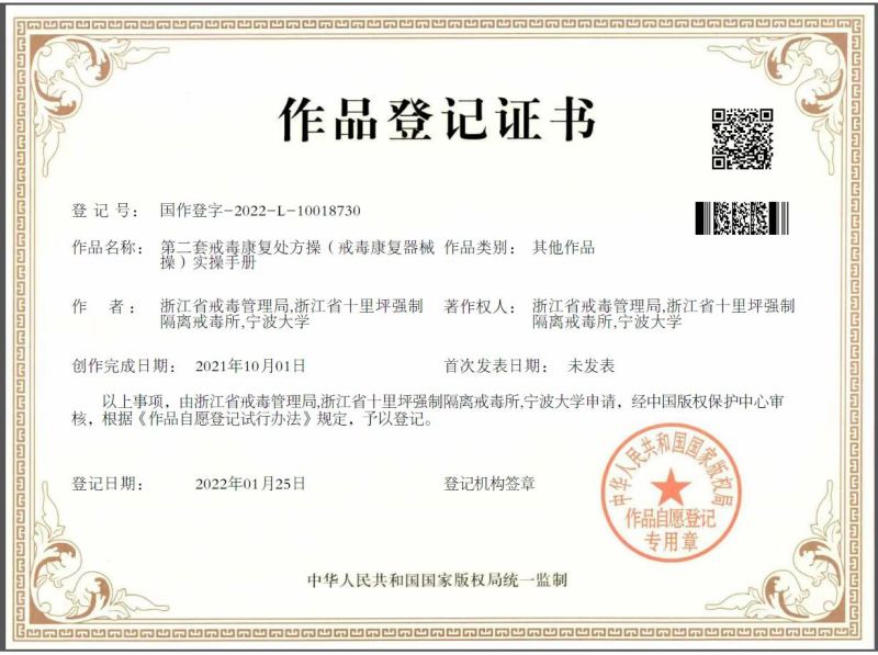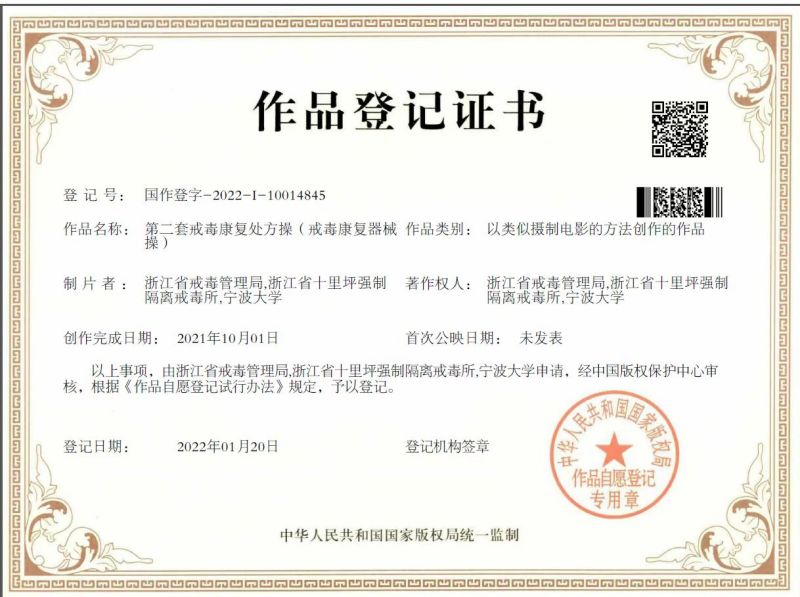 2022年1月25日,第二套戒毒康复器械操获得国家版权局作品登记证书。