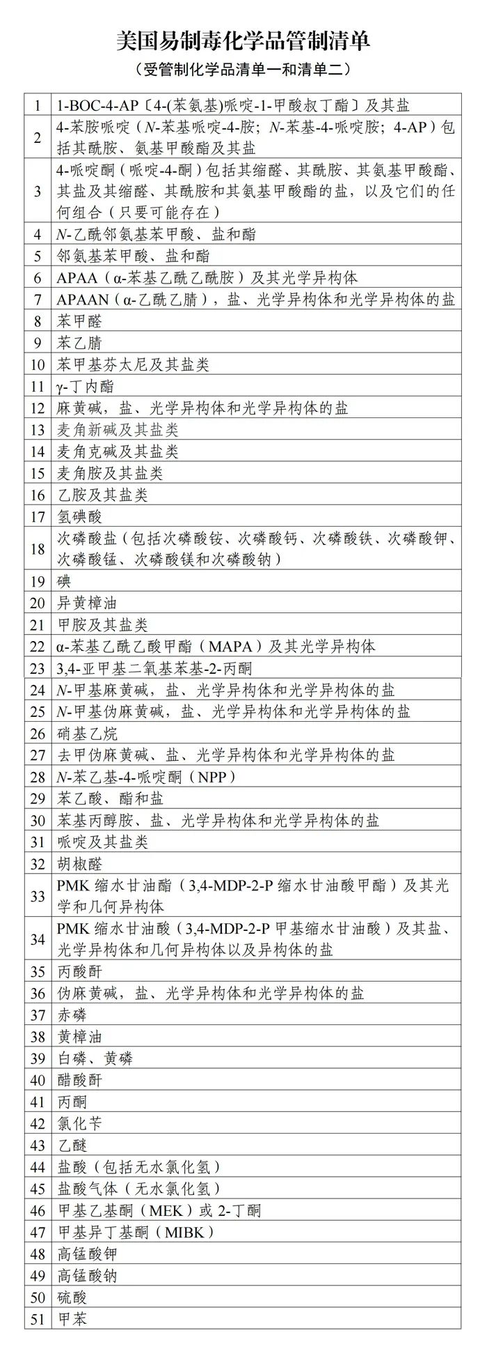 8.涉及美国管制化学品(品种详见附件)的生产、经营、进出口企业和个人应谨慎对待来自美国和墨西哥等相关国家的订单,警惕出口物品被用于制造毒品和可能面临的“长臂管辖”甚至“钓鱼执法”的风险。