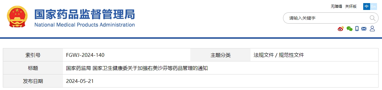 5月21日,国家药监局网站发布《国家药监局 国家卫生健康委关于加强右美沙芬等药品管理的通知》,将右美沙芬、含地芬诺酯复方制剂、纳呋拉啡、氯卡色林列入第二类精神药品目录,公告自2024年7月1日起施行。